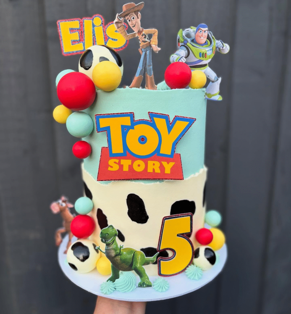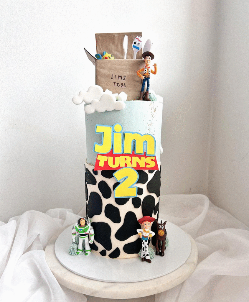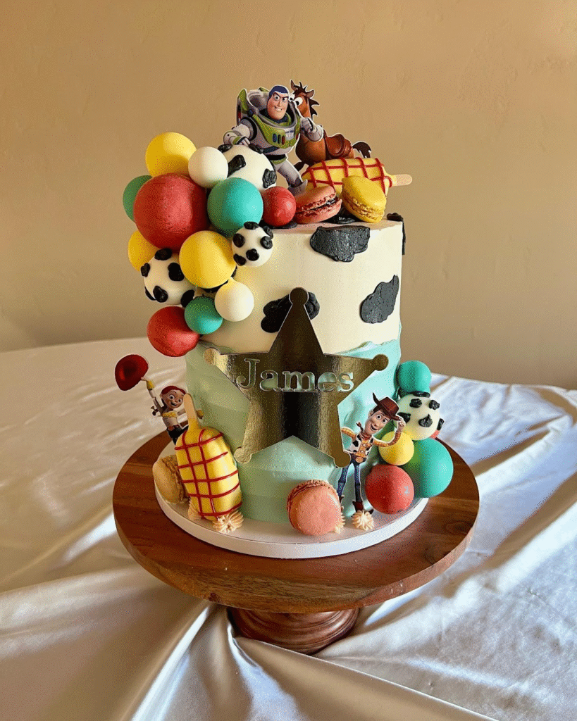 This Toy Story-inspired cake is filled with playful details, including Buzz Lightyear, Woody, and colorful balloons. The cake features a cow-print design, and the “James” golden star topper adds a personalized and fun element.