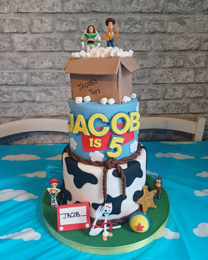 This dynamic Toy Story cake features two tiers adorned with beloved characters like Buzz Lightyear, Woody, and Forky, complete with a “Jacob’s Toys” box and fun cow-print details. The bright and colorful design, including the “Jacob is 5” topper, adds a fun vibe to the celebration.