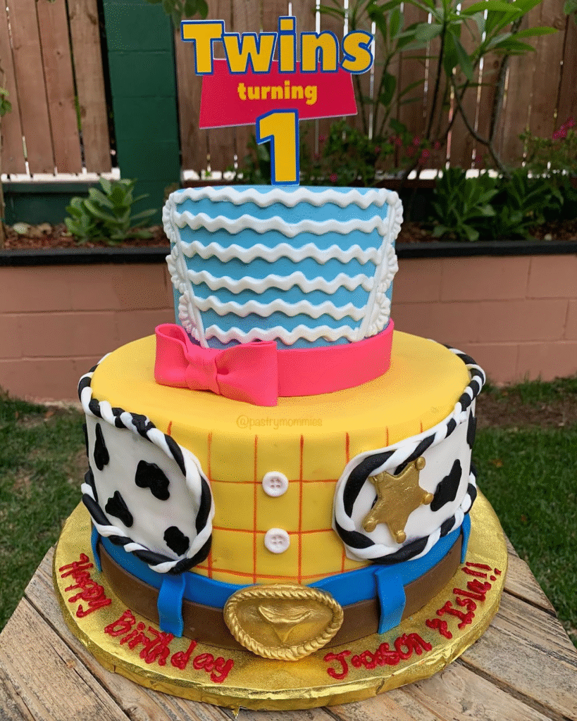 This playful cake features a two-tier design, with the top tier resembling a cowboy hat with blue and pink waves, and the bottom tier mimicking Woody’s yellow shirt with cow-print details. The cake is completed with a sheriff’s badge and a belt buckle for a perfect Toy Story touch.