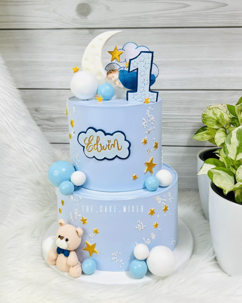 This adorable first birthday cake features a soft blue color palette with celestial stars and moon decorations. A teddy bear and playful balloons add fun, while the “1” topper and the name “Edwin” bring a personal touch.