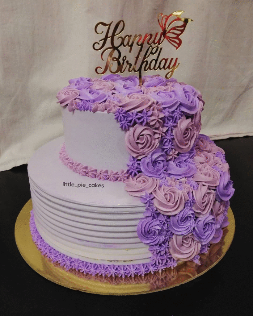 This cake features a gorgeous blend of soft lavender and purple buttercream rosettes, gracefully cascading down the cake. The piped flowers add texture and beauty to the design, while the gold “Happy Birthday” topper adds a touch of luxury.