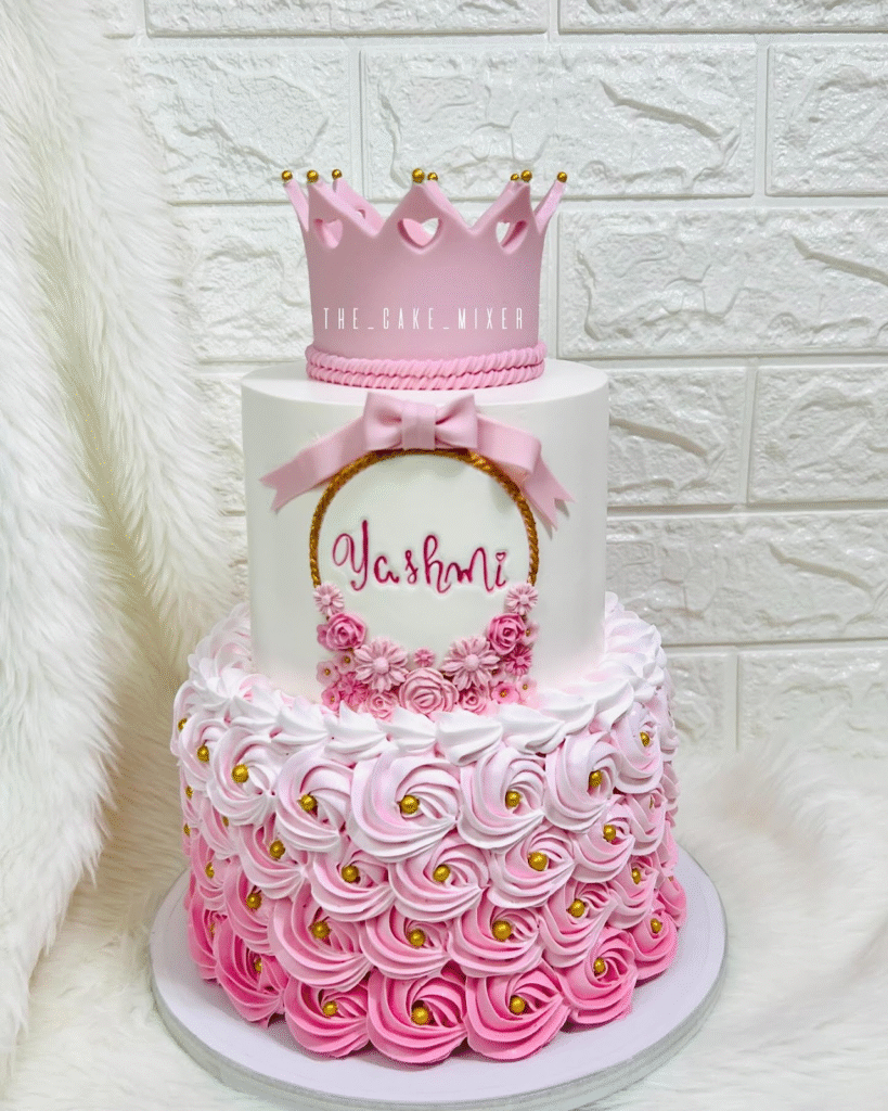With its vibrant pink rosette design and elegant white tier, this cake is a true showstopper. The crown on top adds a regal touch, while the delicate rose accents around the personalized name “Yashmi” make it even more special.