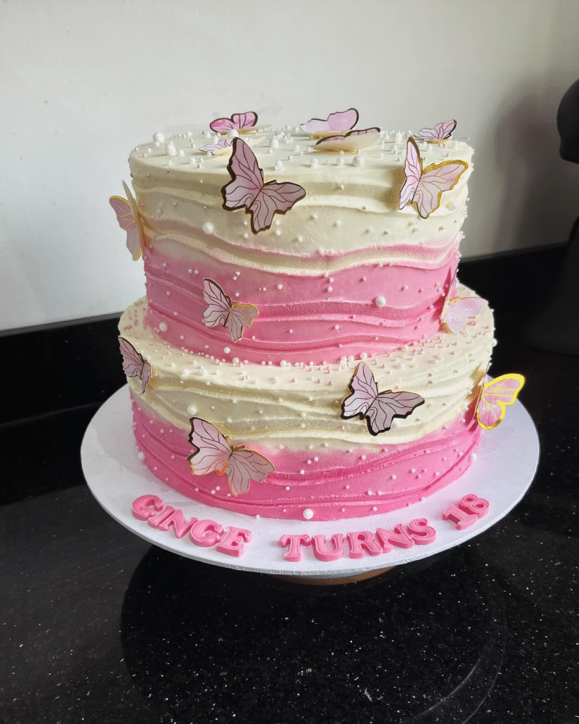 The smooth, ombre pink buttercream on this two-tier cake makes it a showstopper for any celebration. The colorful butterflies and soft white pearls add a playful and elegant touch, perfectly complementing the “Cinge Turns 18” message on the base.