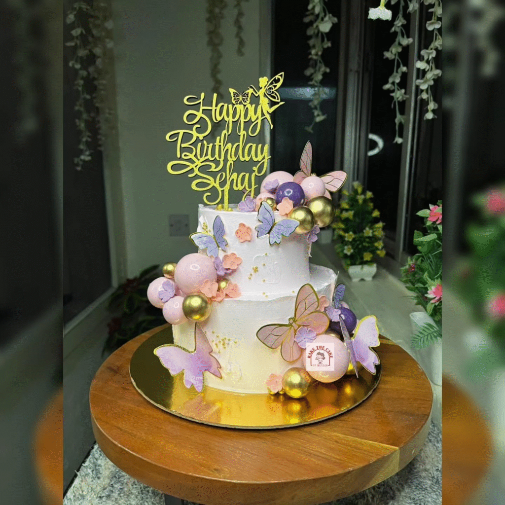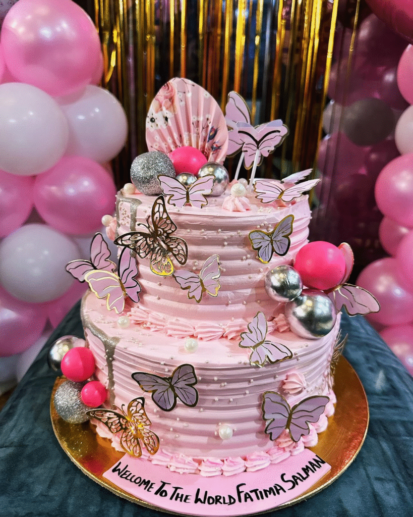 This gorgeous two-tiered cake is the perfect way to welcome Fatima Salman into the world. The soft pink buttercream frosting is beautifully decorated with intricate gold and pastel butterflies, adding an air of elegance.