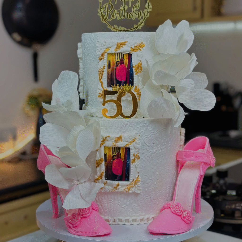 Oversized edible flowers add dramatic flair, while the pair of pink edible heels enhances the personality of the cake. Together, these artistic elements elevate the design, making it both meaningful and visually captivating for a memorable 50th birthday.