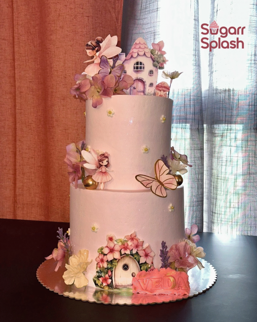 Beautiful pastel shades of pink and lavender enhance the fantasy charm of this two-tiered birthday cake. Decorative golden butterflies, soft blossoms, and fairy characters create an enchanting display that brings a fairytale-inspired celebration to life.