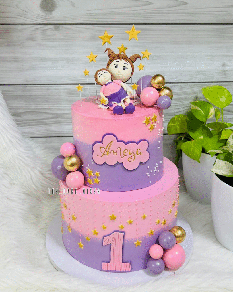 Bright tones of purple and pink blend beautifully in this two-tier masterpiece, giving it a magical touch. Golden stars cascade down, creating a dreamy vibe that fits perfectly for a joyful first birthday celebration.