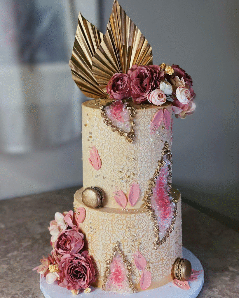 This luxurious two-tier cake features intricate floral designs with deep pink and rose flowers, accented by edible gold and delicate macarons. The stunning gold fan topper adds sophistication, while the geode-style sugar art, filled with pink crystals and gold accents, creates a breathtaking centerpiece.