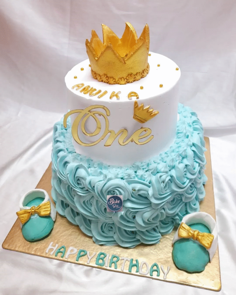 This elegant two-tiered cake features a stunning gold crown on top, making it a royal celebration for little Anvika’s first birthday. The bottom tier is beautifully decorated with soft blue buttercream rosettes, giving the cake a playful yet sophisticated look.
