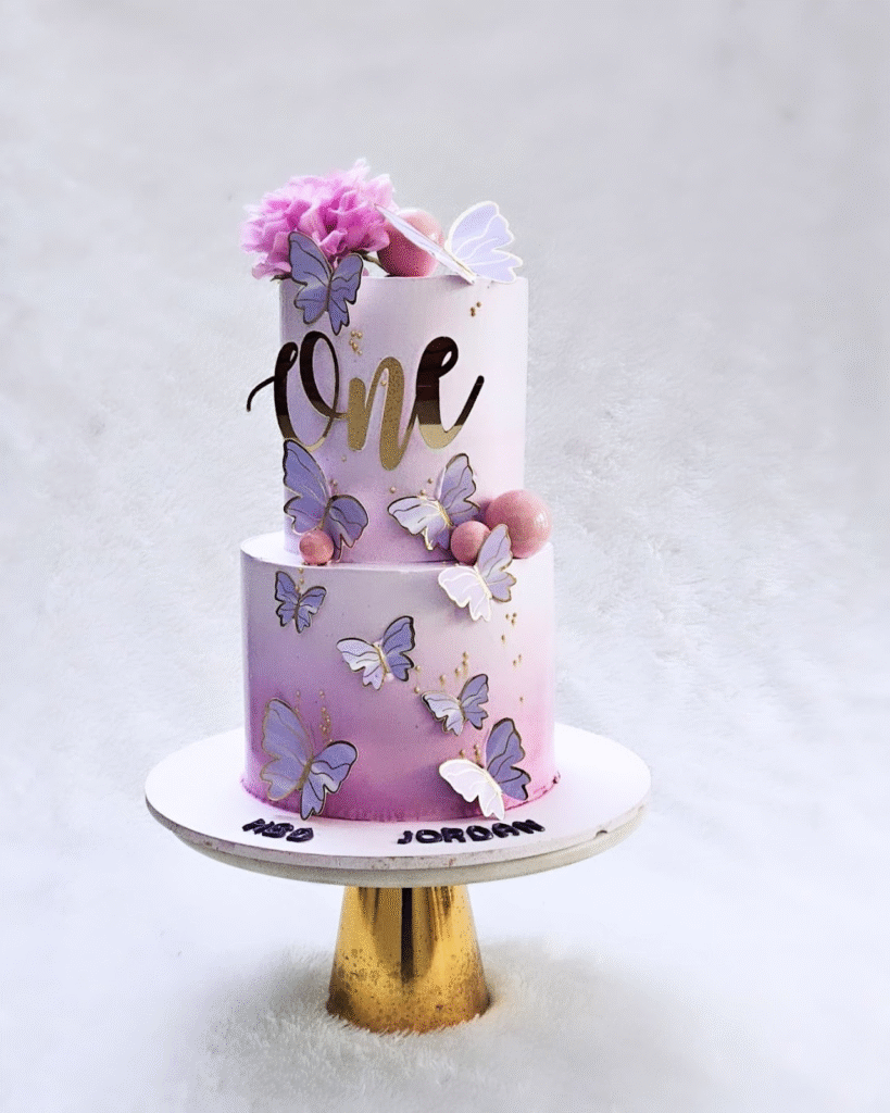 This two-tiered cake features a beautiful ombre design in soft pink and lavender, adorned with delicate butterflies and a few blush pink macarons. The “One” topper in gold adds a regal touch, while the pink peony on top gives the cake a fresh and floral finish.