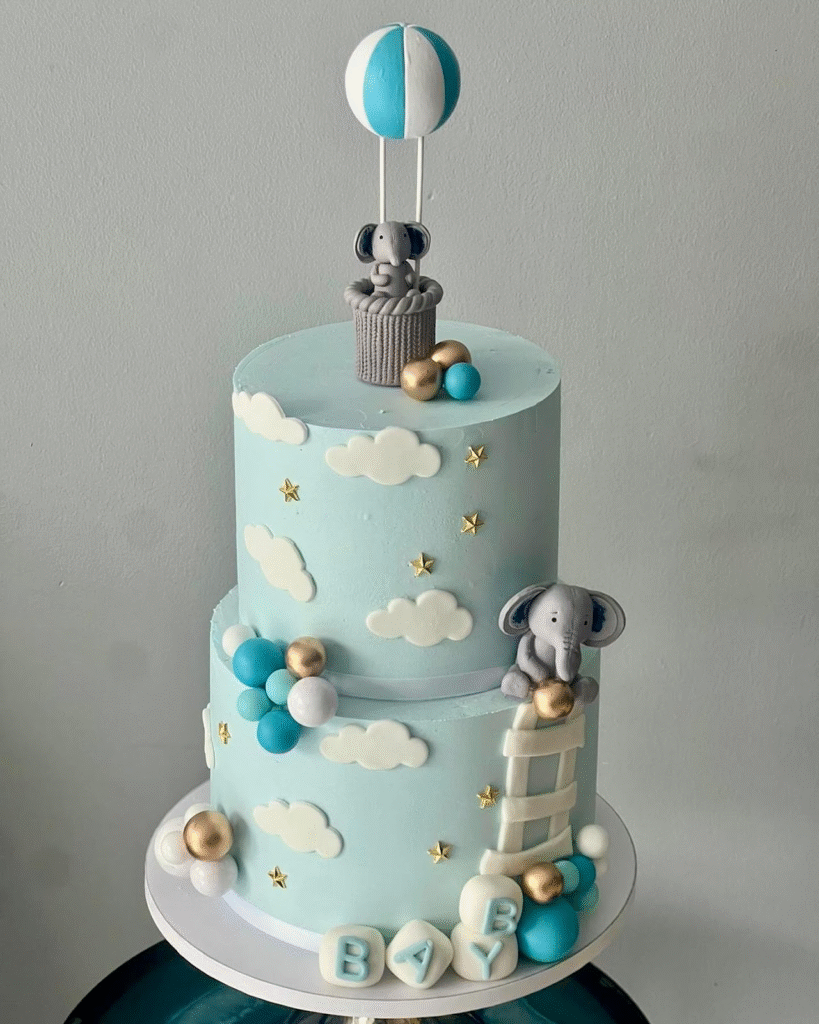 This adorable cake features a soft pastel blue buttercream base, decorated with cute clouds, golden stars, and playful elephant figurines. The “B-A-B-Y” blocks and colorful balloons around the bottom tier enhance the joyful vibe, while the hot air balloon adds a touch of whimsy.