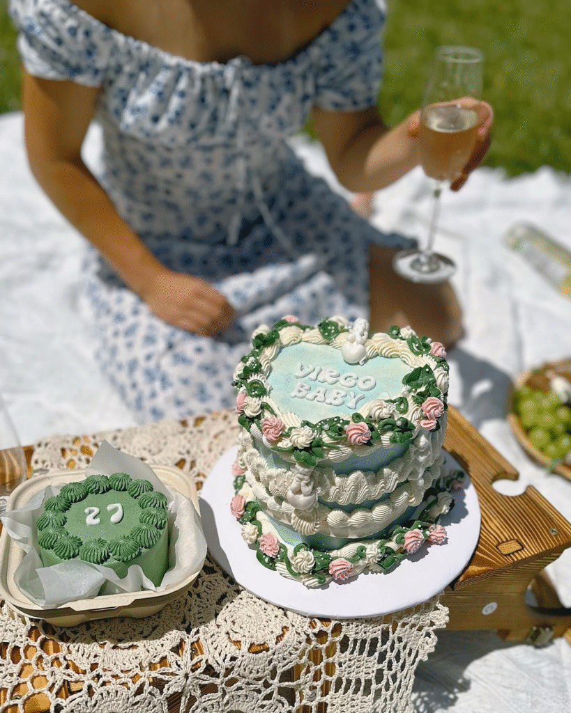 Set against a cozy picnic backdrop, this pastel-themed cake brings Virgo season to life with vintage charm. The two-tiered design is frosted in soft blue, adorned with piped cream swirls, green leaves, and delicate pink roses.