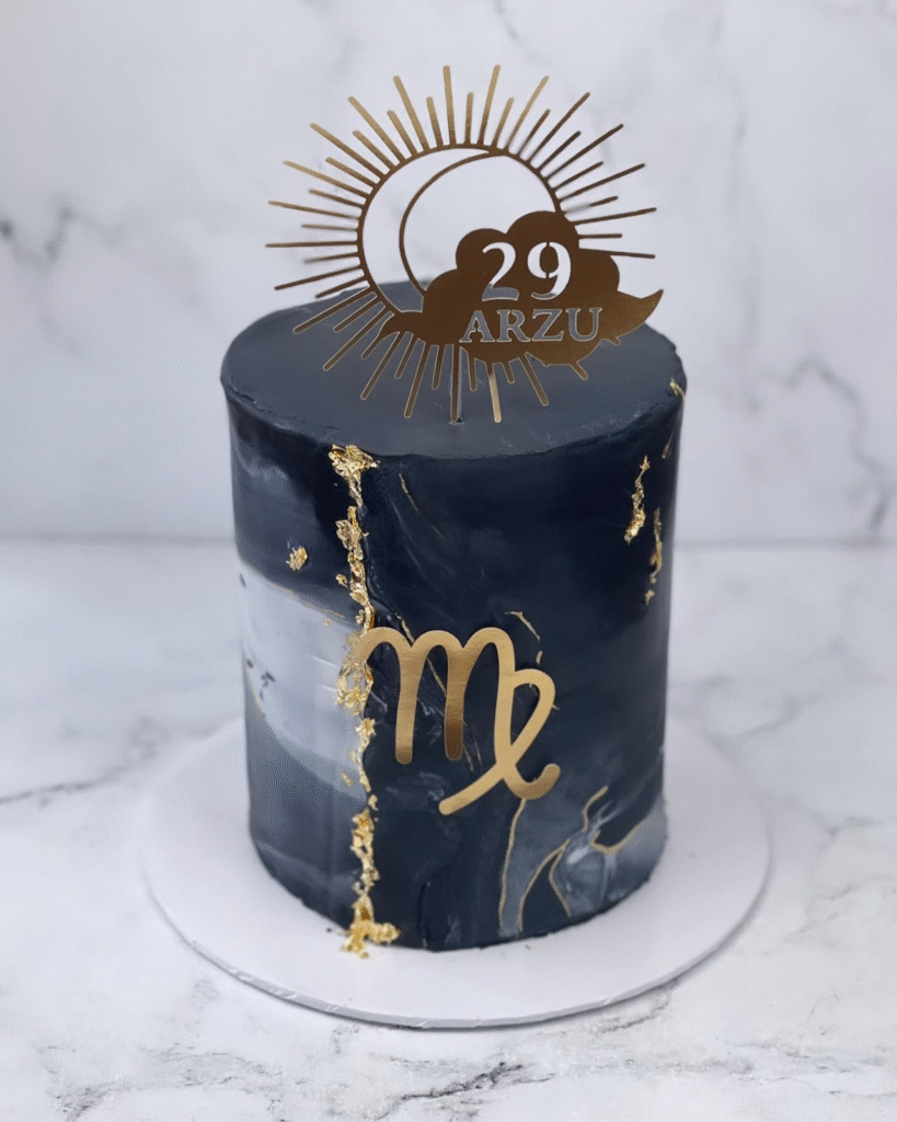 A radiant topper with sunburst lines, a crescent moon, and personalized details—29 Arzu—adds a cosmic aura to the cake. The interplay of matte dark tones and glimmering gold leaf creates a balance of mystery and opulence, making this centerpiece perfect for an elegant Virgo celebration.