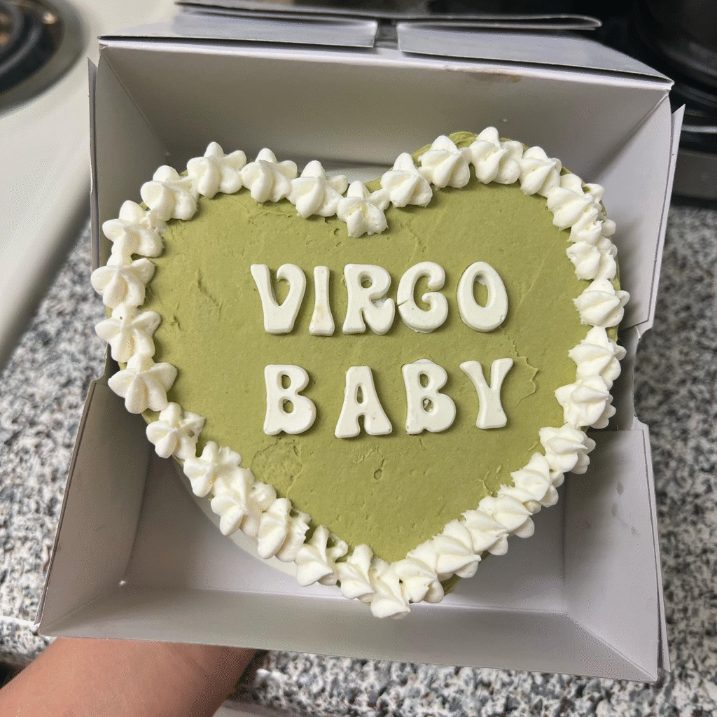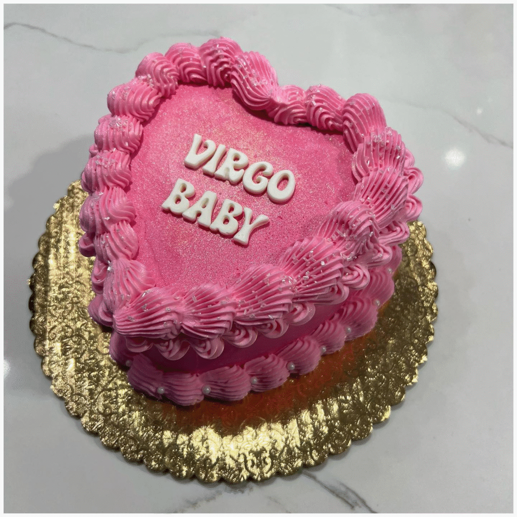 Playful and charming, this heart-shaped cake embraces zodiac pride with the bold message “VIRGO BABY” in white frosting letters. The muted sage-green base provides a trendy, modern aesthetic, while the piped cream border adds a soft, homemade touch.