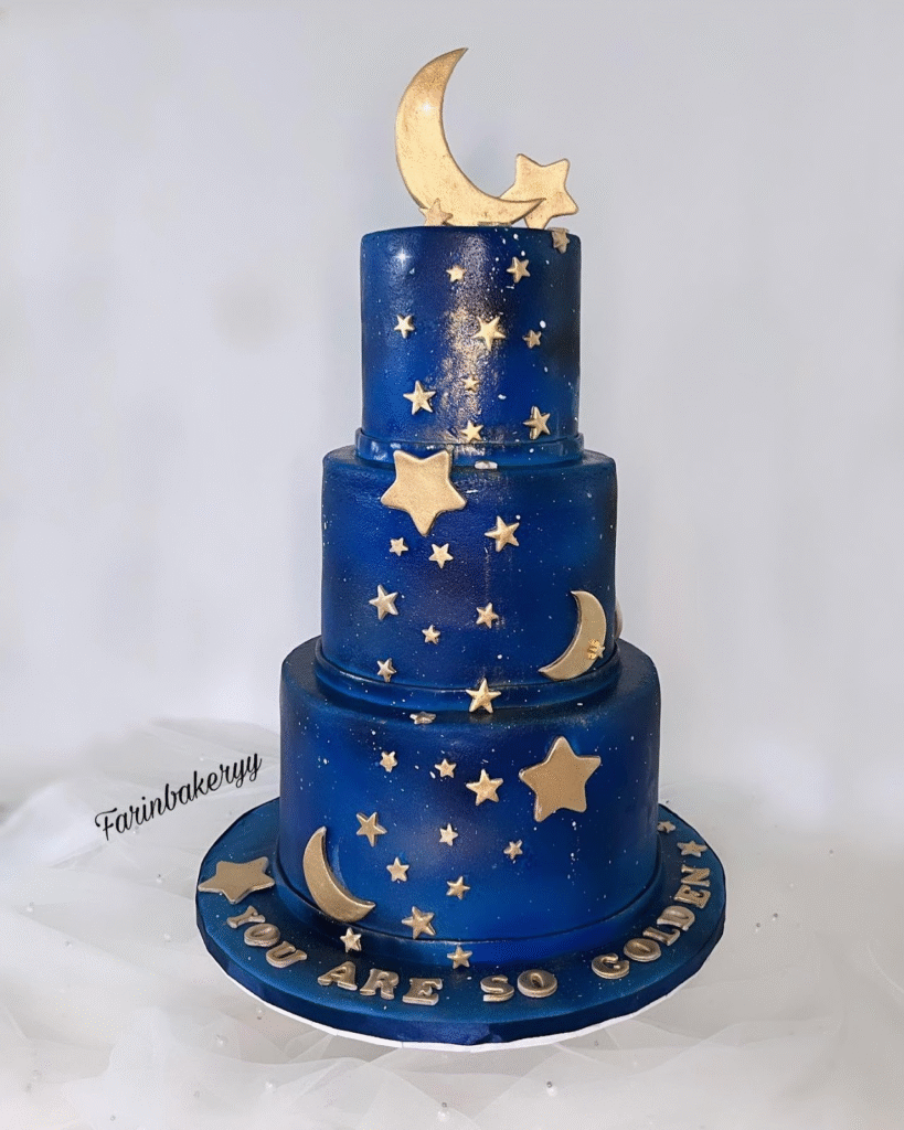 This towering three-tiered cake dazzles like a night sky lit by starlight. Wrapped in a rich navy-blue glaze, each tier is sprinkled with clusters of golden stars and shimmering moons, creating a scene straight from the cosmos.