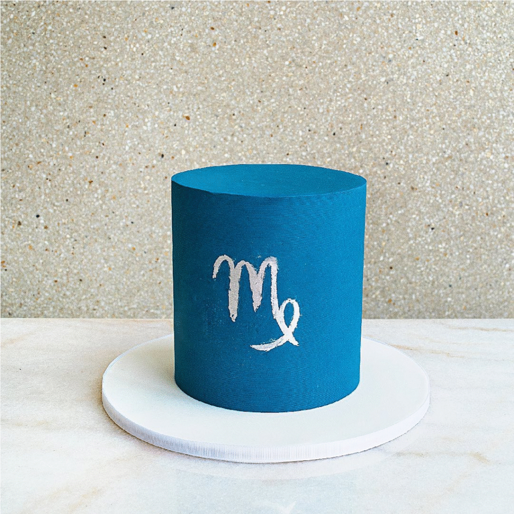 Sleek and modern, this cake embraces a minimalist approach with a bold teal-blue exterior and a single silver Virgo zodiac symbol at the center. The smooth, flawless finish gives it a refined, contemporary look, perfect for those who value understated beauty.