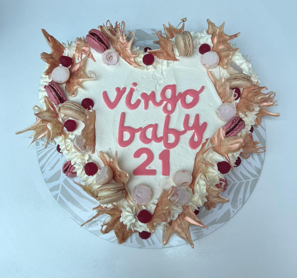 Radiating elegance, this heart-shaped cake celebrates a Virgo’s milestone 21st birthday with chic details. The smooth white frosting serves as a clean base for bold pink lettering reading “Virgo baby 21,” bringing personality and astrological pride to the centerpiece.
