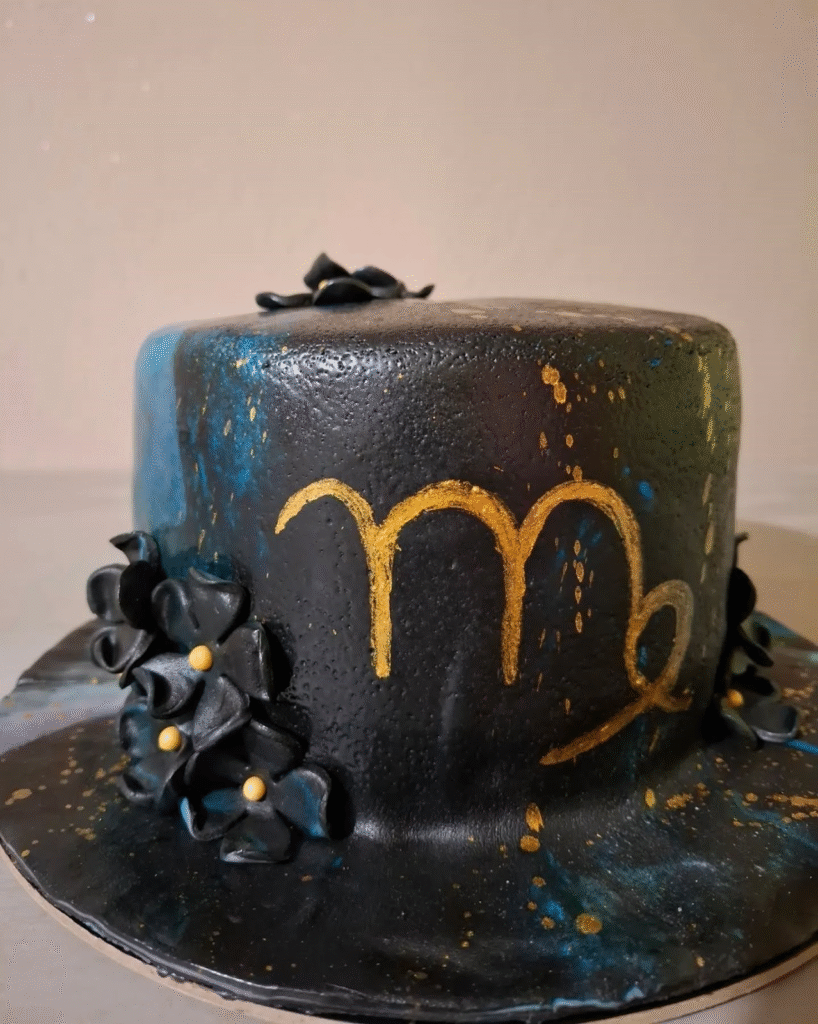 Bold and dramatic, this Virgo-inspired cake embraces a cosmic aesthetic with a sleek black fondant base accented by golden splatters. The Virgo zodiac symbol, painted prominently in shimmering gold, becomes the focal point, radiating celestial charm.