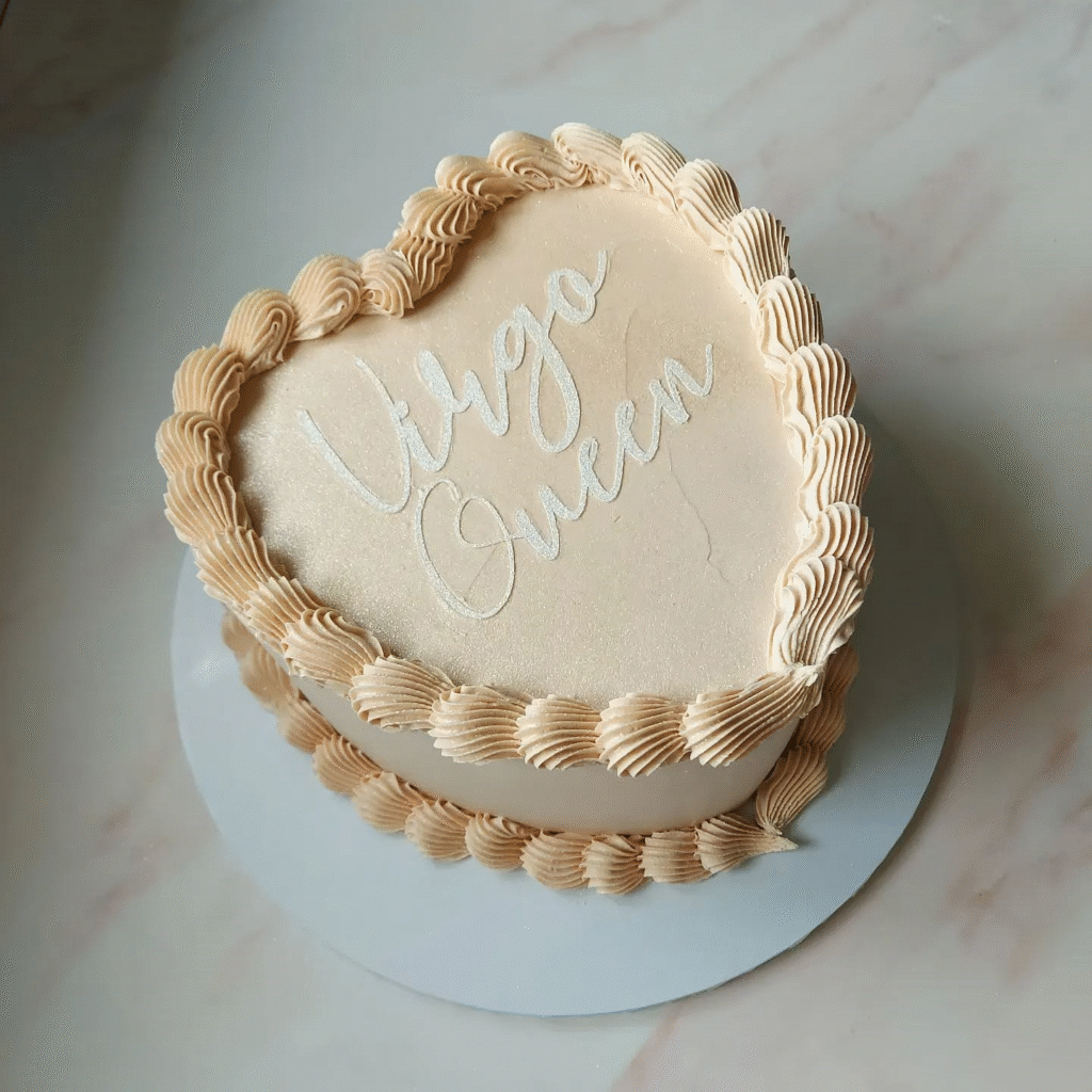 Graceful and refined, this heart-shaped cake radiates sophistication with its smooth, champagne-toned frosting and pearl-like shimmer. The words Virgo Queen are inscribed in elegant script across the surface, making it a tribute fit for royalty.