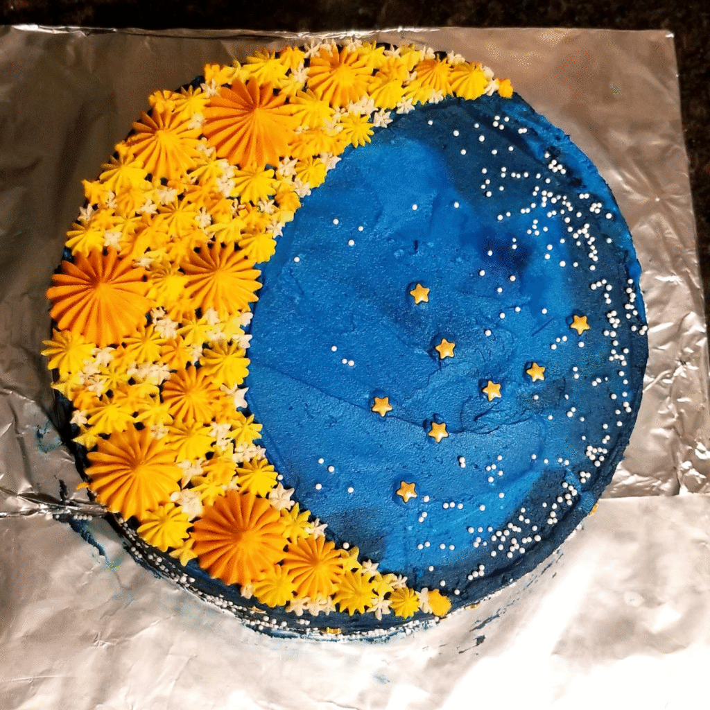 Evoking the harmony of day and night, this stunning round cake features a crescent of golden-yellow buttercream flowers against a deep blue galaxy-like backdrop. Radiating petals and delicate white blooms form a sun-kissed arch, gracefully transitioning into a starlit sky.